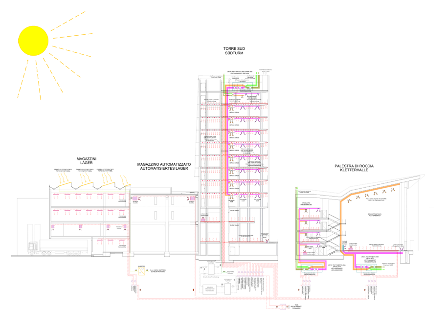 Planung und Bauleitungzur Errichtung der Mechanische- und Elektroanlagen im neuen Sitz der SALEWA in Bozen Süd, Ausarbeitung des Brandschutzprojektes und des Notfallmanagements