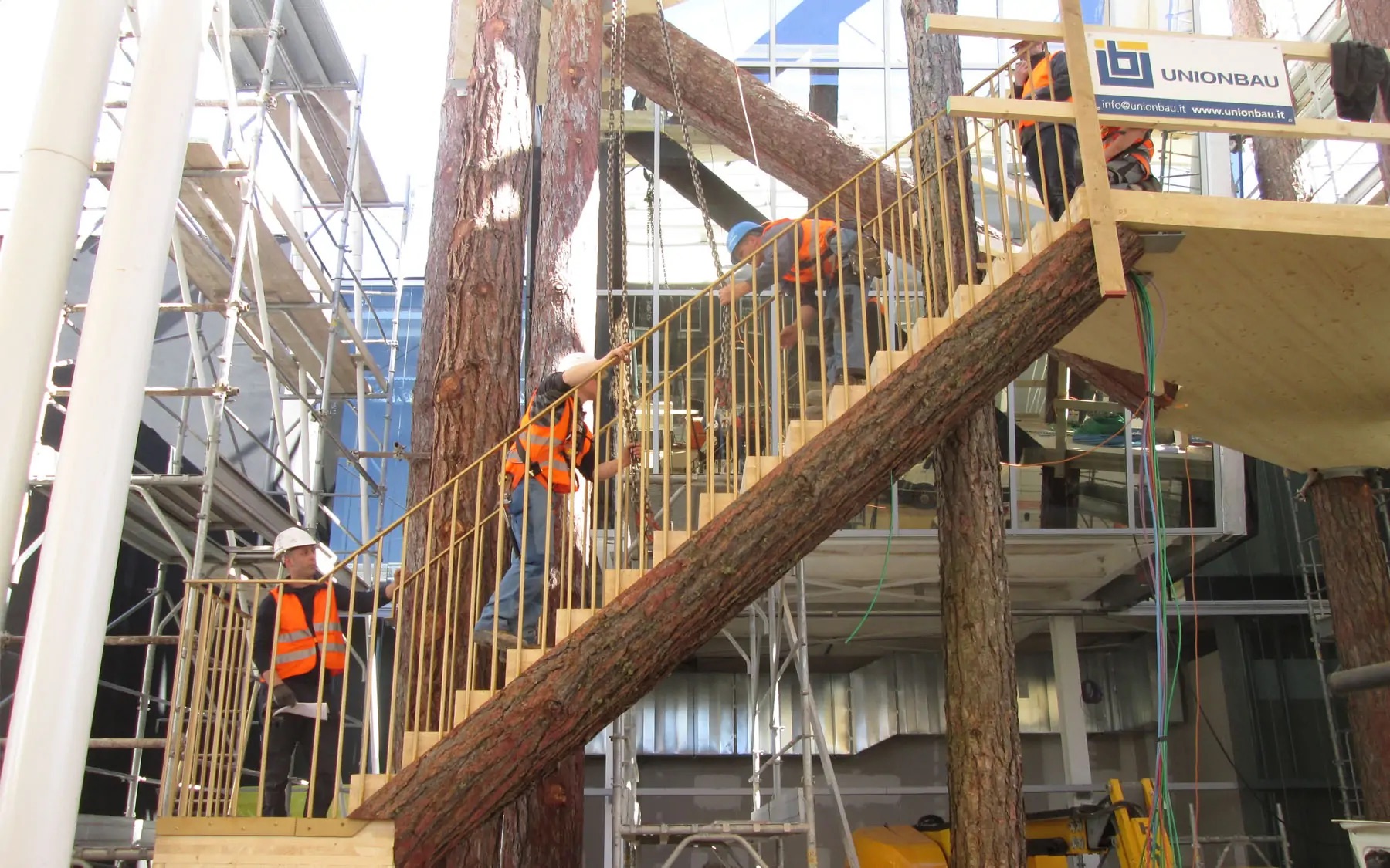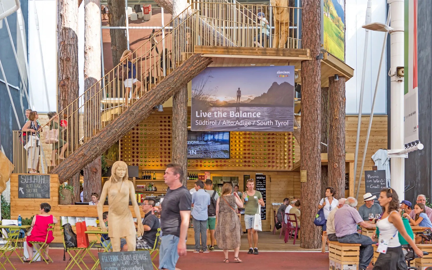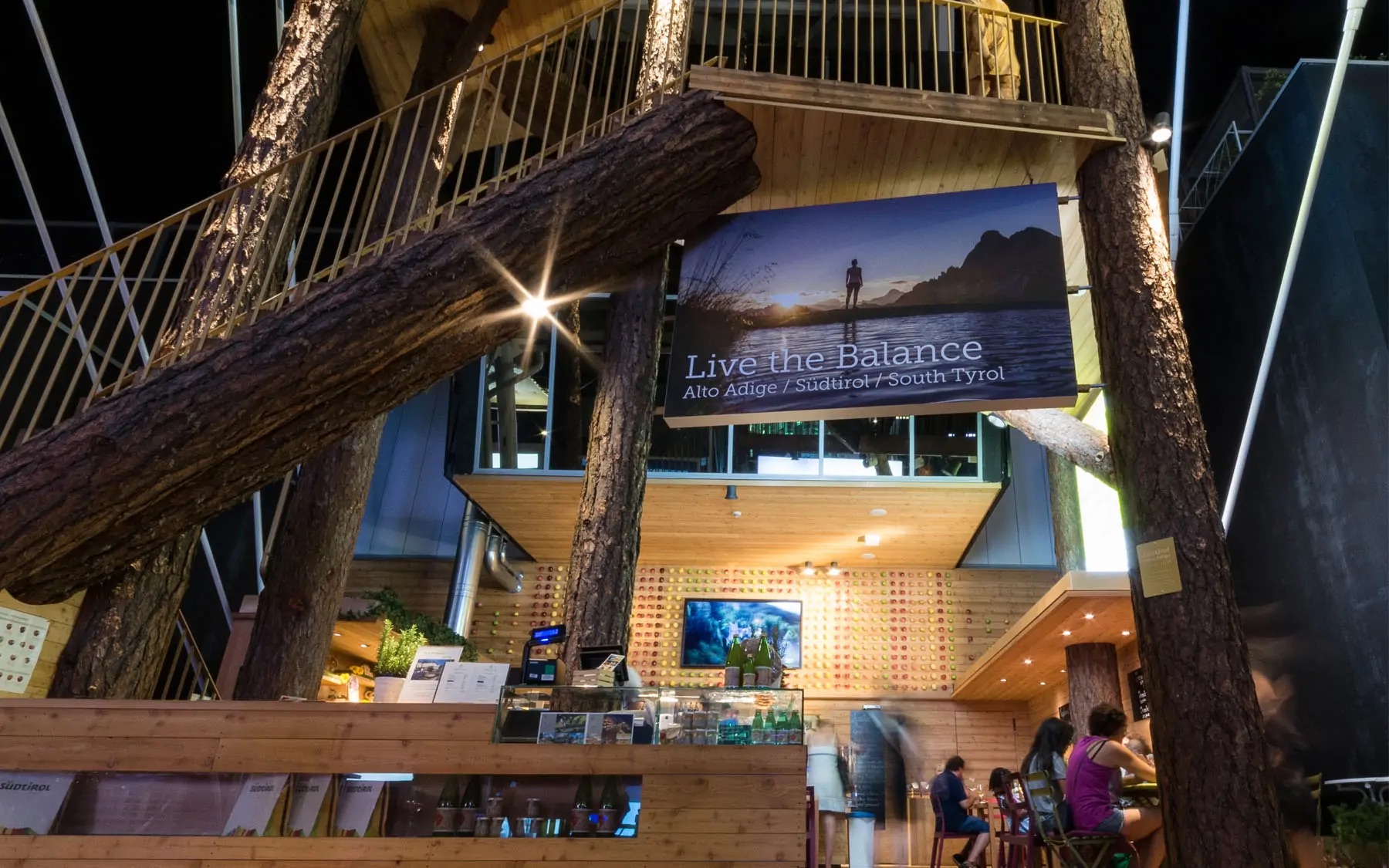 Der Südtirol-Stand befindet sich entlang einer der Hauptachsen des Ausstellungsgeländes. Das Gebäude mit einer Grundfläche von ca. 75 Quadratmetern wird von sieben Baumstämmen getragen, die den sieben Themenbereichen entsprechen. Durch die aufragende Struktur, 13 Meter hoch, entsteht eine dynamische Architektur, welche die Gäste erleben, erwandern und erklimmen können. Der Eingangsbereich ist vor allem der Kulinarik gewidmet, die oberen Etagen bieten Gelegenheiten für Gespräche und zum Entspannen. Gastfreundschaft und Natur stehen für Südtirol, das Motto ‚Live the Balance‘ zieht sich wie ein roter Faden durch das gesamte Projekt.