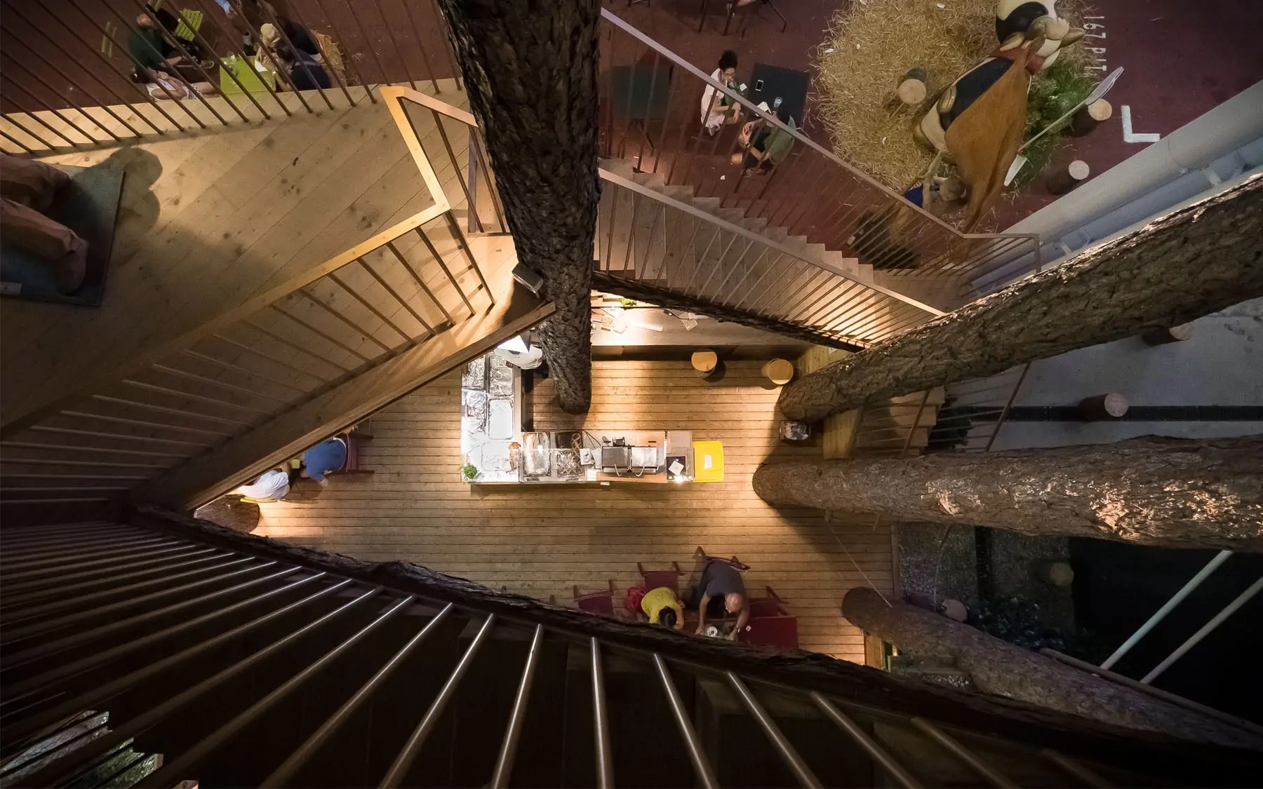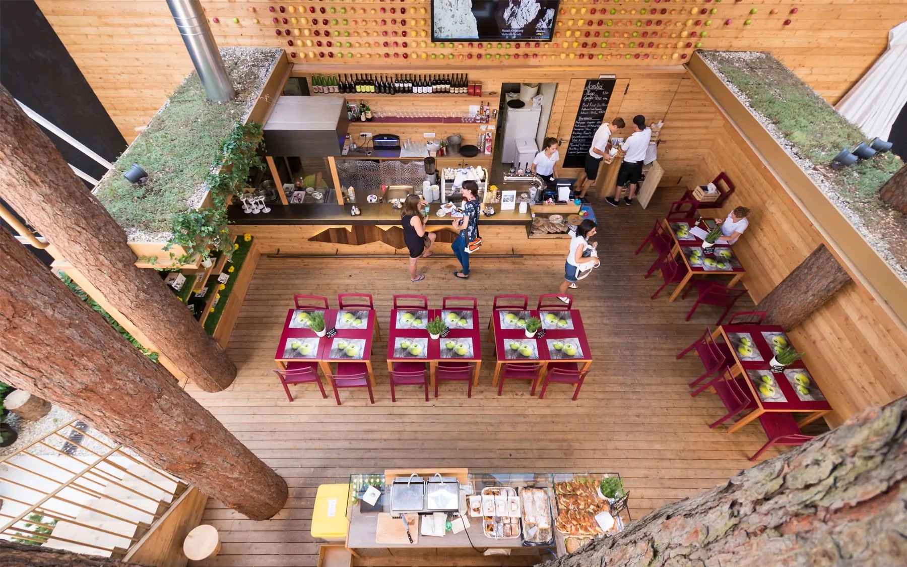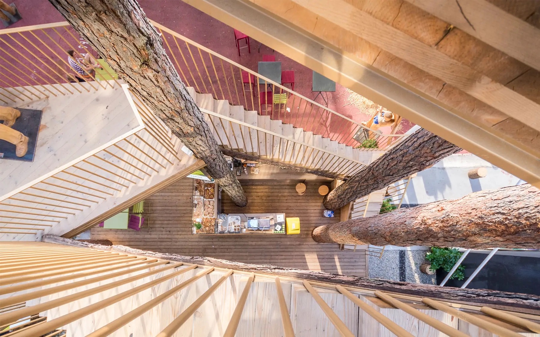 Der Südtirol-Stand befindet sich entlang einer der Hauptachsen des Ausstellungsgeländes. Das Gebäude mit einer Grundfläche von ca. 75 Quadratmetern wird von sieben Baumstämmen getragen, die den sieben Themenbereichen entsprechen. Durch die aufragende Struktur, 13 Meter hoch, entsteht eine dynamische Architektur, welche die Gäste erleben, erwandern und erklimmen können. Der Eingangsbereich ist vor allem der Kulinarik gewidmet, die oberen Etagen bieten Gelegenheiten für Gespräche und zum Entspannen. Gastfreundschaft und Natur stehen für Südtirol, das Motto ‚Live the Balance‘ zieht sich wie ein roter Faden durch das gesamte Projekt.